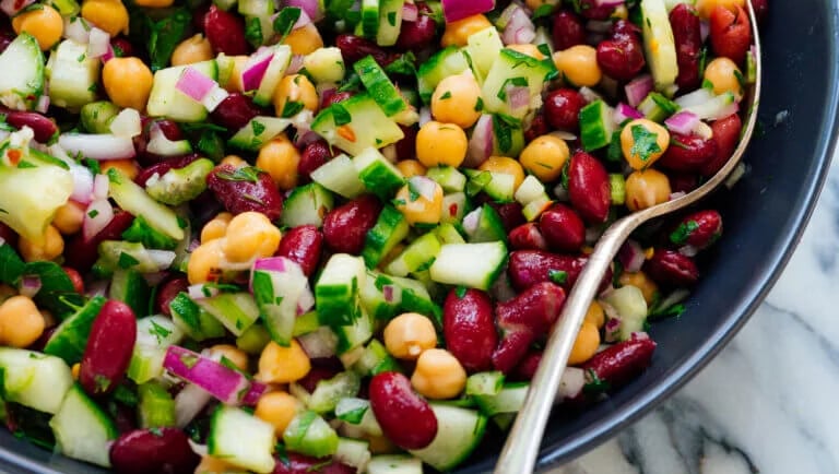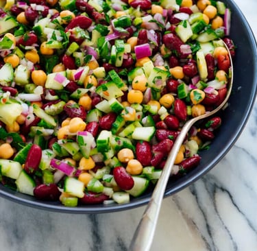 The salad is a harmonious blend of crisp textures and vibrant Mediterranean flavors. Robust kidney beans and chickpeas provide a hearty base, complemented by the refreshing crunch of cucumber, celery, and red onion. The simple yet impactful combination of lemon, olive oil, garlic, and a medley of fresh herbs creates irresistible results.